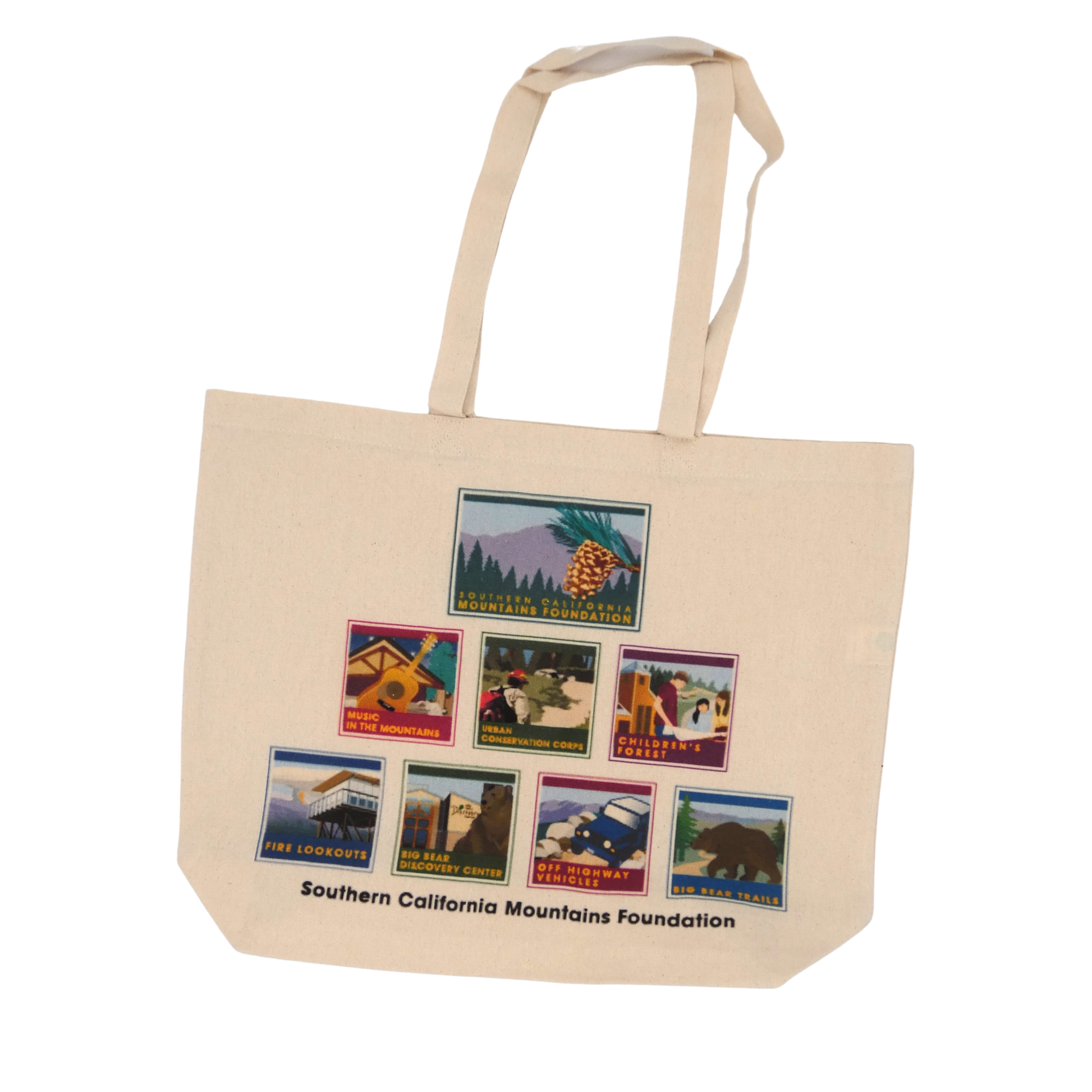 Carry your love for the forest - and every program that protects it - with our large canvas tote. Featuring full-color square icons representing all Southern California Mountains Foundation programs, this sturdy and spacious bag is perfect for farmers markets, trail gear, or daily use. Show off your support in sustainable style while repping everything from fire lookouts to off-highway vehicles.